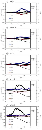 At the onset of the scouring action, Figure 9a reveals a dominant TKE (blue filled circle) prevailing along the initial flatbed with a local maximum value between x/Dp = 1–1.5. This location is reasonably correlated with the core of the near-bed vortex (V3) as shown in Figure 5a2. As the scour hole develops, the overall TKE profile undergoes a significant reduction (see Figure 9b–d), which reflects a weakening of the scouring capacity associated with the scour-driving vortex. This inference is in conformity with the inference that one may deduce from the turbulent energy spectra plots. The local increase in TKE (around x/Dp = 2 at the quay wall), on the other hand, is likely attributed to the presence of the corner vortex that formed at the junction between the scour bed and the quay wall. At the asymptotic state (t = 24 h), when the scour process almost ceases altogether, the near-bed TKE distribution drops to approximately zero (see Figure 9e).