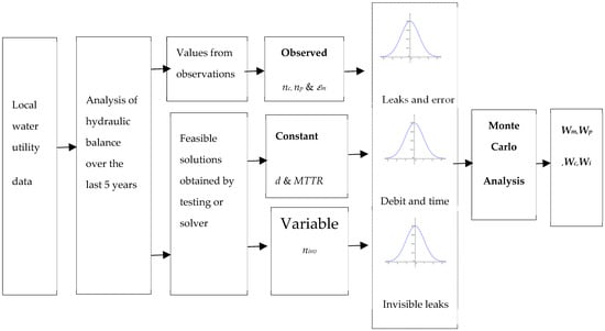 Figure 1. In the absence of data concerning the characteristics of leaks, normal distribution functions are used to randomly generate the flow rate, the number of leaks and time to repair. The achievement of this analysis provides a potential range of values for parameters of Equation (7) that make the estimation of water losses possible for prediction purposes.