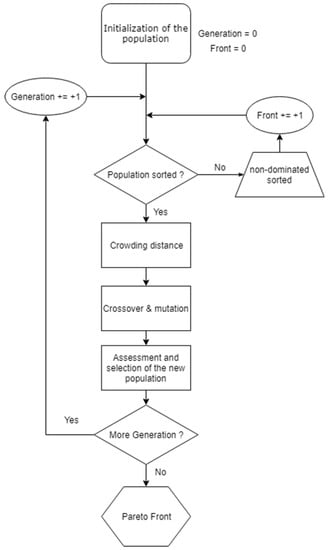 Performed tests guide the choice of the type of selection, crossover and mutation operators. To solve the considered problem (see Equations (22) and (23)), the NSGA II is implemented with an initial population generated randomly with 1000 individuals. The crossover probability is set to 90% to generate the offspring using the flat crossover. The polynomial mutation is used with an index polynomial mutation of 1 and a mutation probability of 25%. The new population is selected from roulette wheel selection. The number of performed generations is 25.