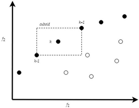 The individual with the lower rank, according to the non-dominated sorting algorithm, is preferred. If two individuals have the same rank, the one which is located in the lower density of solutions is preferred.