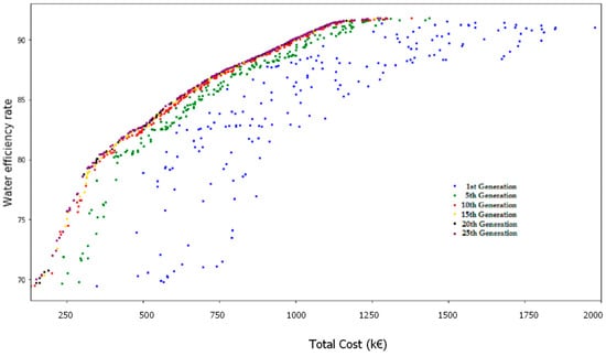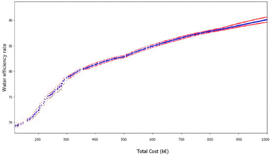 Figure 8 illustrates the Pareto front obtained for the considered objectives. The blue dots forming the front in the middle correspond to the average value of the water efficiency rate predicted by the ANN model. The red dots forming the upper and lower fronts define the limits of the 95% confidence interval. Each point of the front represents the 4-tuple of the constrained decision variables of the problem: the rate of pipes renewal, the rate of connections renewal, meters renewal, and length proven by leak detection.
