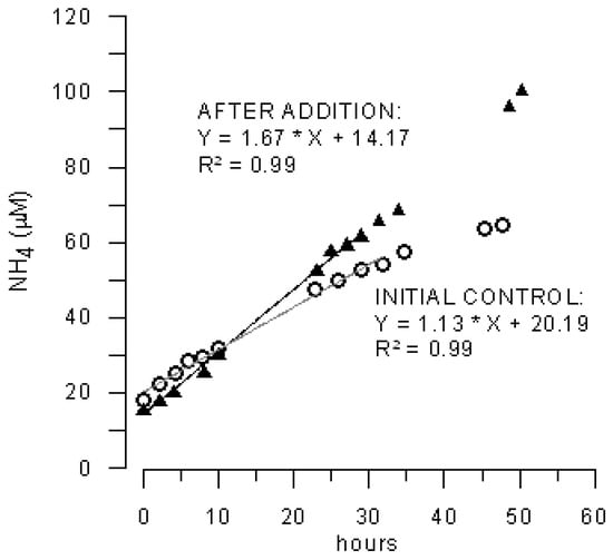 Ammonium concentration before (open dots, calculated initial control flux 4.18 mmol m−2 day−1, n = 10) and after Marenzelleria neglecta addition (shaded triangles, calculated flux after addition 6.28 mmol m−2 day−1, n = 9) in experiment 2 (run 1).