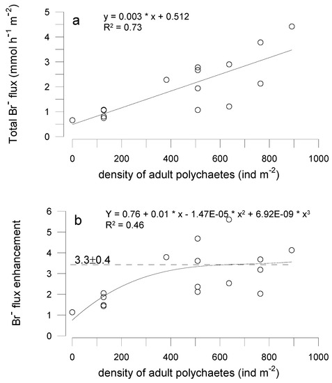 Total bromide flux (a) and tracer flux enhancement (b) vs. density of polychaetes found in the sediment after incubations. The horizontal dashed line denotes average flux enhancement estimated for the unmanipulated natural sediment.
