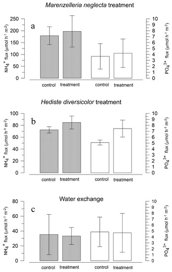 Addition of the native species H. diversicolor (run 2) resulted in a 17% higher flux of NH4+ and a 40% increase in PO43− flux (Figure 5b). Although treatment effect on PO43− flux was substantially higher than after the addition of M. neglecta, the observed increase was not significant.