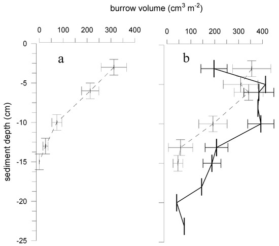 Vertical distribution of macrofauna burrow volumes (vertical bars: depth range; horizontal bars: standard errors) in the soft-bottom habitats occupied by community of chironomids (1700 ± 1300 ind m−2, n = 21) and oligochaetes (950 ± 900 ind m−2, n = 21) (a) before and (b) after invasion of M. neglecta (300 ± 180 ind m−2, n = 13). Dashed lines denote burrow volumes of chironomids and oligochaetes, solid line — burrow volumes of M. neglecta. Modified after [77].