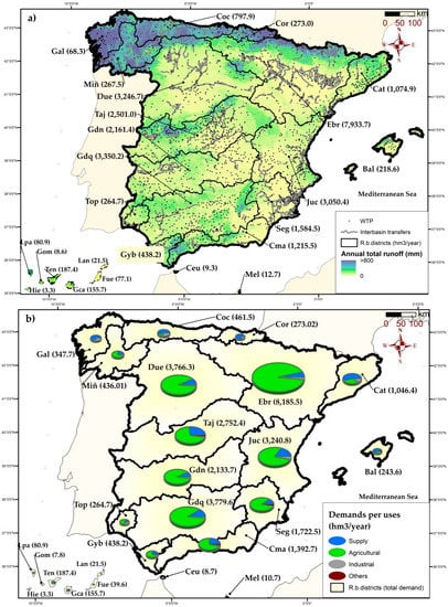 Figure 1 shows the above mentioned water balance, in Spain, among water inputs (Figure 1a) and water demands (Figure 1b) in 2017. It should be noted the water shortage located in South-East Spain despite the resources provided by numerous interbasin transfers beside wastewater reuse and desalination. For instance, the Segura and the Júcar river basin districts each presented water scarcity close to 200 hm3 considering their water inputs (1584.5 hm3 and 3050.4 hm3) together with their total water demands (1722.5 hm3 and 3240.8 hm3 respectively).