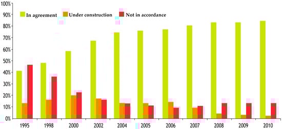 In 2006, 76% of the total wastewater treatment plants (WTP) in Spain reached requirements fixed by the Directive 91/271/EEC, with an additional 13% of ongoing treatments and 11% of not conforming cases (due to inadequate or lacking treatment). During the 1995–2010 period, Spain only purified 84% of its total wastewater; and although the equivalent not conforming population decreased greatly, reaching a total of 10,909,722 equivalent inhabitants (16%) in 2010, the accomplished effort has not been sufficient and Spain did not fulfil objectives set by the European Union through the Directive 91/271/EEC [,,]. Figure 2 depicts the Spanish evolution of the compliance degree or acceptance with the purification European regulation. It is evident that remarkable progress has been achieved in Spain as a consequence of the PNSD application.