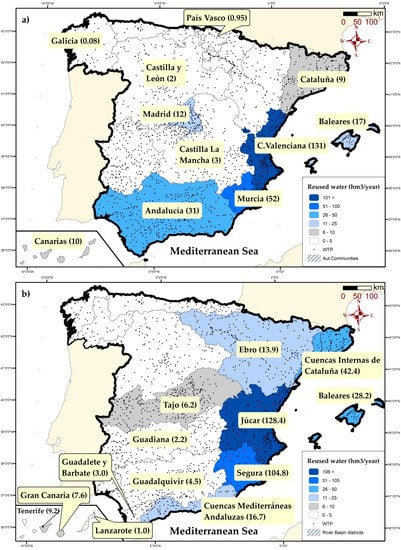 - Since 2008, and according to data collected from the Spanish River Basin districts, the volume of wastewater reused in Spain is 447 hm3/year [,].
