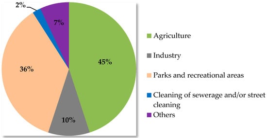 Currently, reclaimed waters present numerous and varied uses in the world [,,,,,]. The main uses of reclaimed waters in Spain are shown in Figure 4. Firstly, it should be noted the use in the agricultural sector, with more than 40% of the total reused wastewaters, which are used for the irrigation of pastures, agriculture, woody crops, ornamentals, nurseries and forages, products of human consumption in fresh, among others [,,]. However, according to [] around the 70% of the total reused in Spain (261.4 hm3/year) is used in the agricultural irrigation, the main use (end use) of the treated effluents. Generally, most references do not involve, within the agricultural use, irrigated lands which use raw water such as in forest areas. In particular, reclaimed waters, used in the irrigation of forest spaces, must be adapted to the quality limits required by the Royal Decree 1620/2007 []. Thus, more than 80% of the total reused in Spain (310 hm3/year) would reach taking into account volumes to irrigate agricultural and forest areas []. Therefore, agricultural is the use that can contribute most to reduce water supply from surface and groundwater resources and, consequently, ensure the natural environment conservation [,,,,].