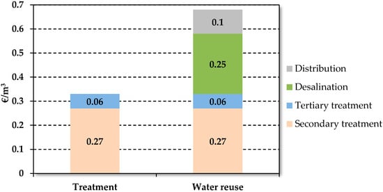 In the framework of the European Union, no specific subsidies are available to promote wastewater reuse [,,]. Existing procedures can be included into two categories: mechanisms to finance initial costs and mechanisms applied to operating costs. However, in Spain there are no reclaimed water markets, being difficult to obtain a price for this product. Therefore, it is assumed that the cost per cubic meter must be equal to the maximum selling price, ensuring that the costs are covered. Thus, in order to promote wastewater reuse, it is essential to create pricing policies that distribute regeneration costs and the management of wastewaters among the total consumption, establishing incentives to ensure that reclaimed waters are used, whenever possible, in all sectors [,,].