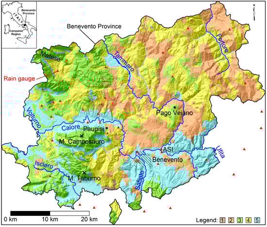 Outcropping of litho-technical sequences in the Benevento province (modified from []). Legend: (1) Predominantly pelitic sequences (from low to medium degrees of tectonization); (2) predominantly pelitic sequences (high degree of tectonization); (3) rock sequences (from low to medium degrees of tectonization); (4) rock and complex successions (high degree of tectonization); (5) coarse clastic and/or inhomogeneously lithified sequences. Rain gauges considered for our analysis are reported using red symbols. The industrial area of Benevento (ASI) is labeled.