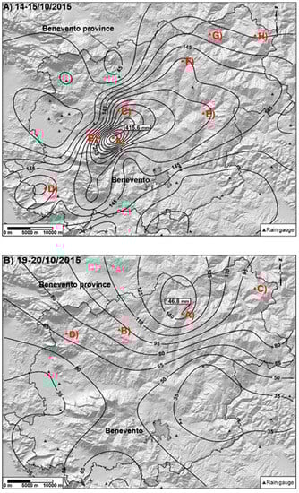 The spatial distribution and the temporal evolution of the two storms on 14–15 October and 19–20 October 2015 were reconstructed using data from a network of 52 rain gauges located in the Benevento province and on its contours (see Figure 1 and Figure 2 for location). Of these meteorological stations, 33 are managed by the Agro-meteorological Center (Centro Agrometeorologico Regionale, C.A.R.) of the Campania Region, and they documented both events. The remaining 19 stations are distributed only in the Benevento province and managed by the Campania Region Civil Protection (Centro Funzionale Multirischi della Protezione Civile della Regione Campania). To reconstruct the rainfall spatial distribution that characterized both the first and the second storm, we interpolated the total rainfall using a radial basis function in a Geographic Information System (GIS) environment. Data from stations outside of the Benevento province were used to improve the spatial interpolation along the boundary.