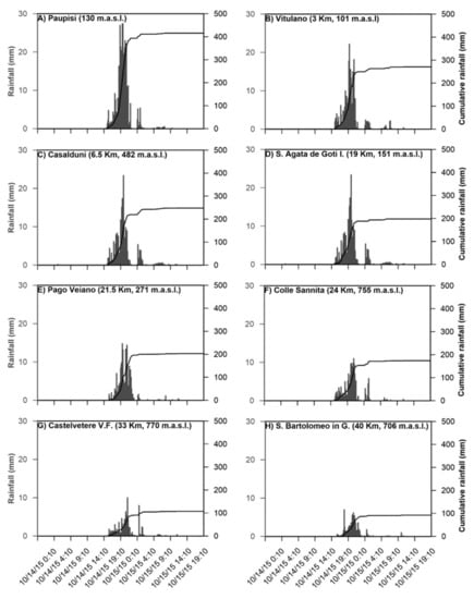 Ten-minute and cumulative rainfall registered during the event on 14–15 October 2015 by some significant stations, starting from the maximum peak of intensity (Paupisi). See Figure 2 for station locations. (A) Paupisi (130 m a.s.l.); (B) Vitulano (3 km, 101 m a.s.l.); (C) Casalduni (6.5 km, 482 m a.s.l.); (D) S. Agata de Goti I. (19 km, 151 m a.s.l.); (E) Pago Veiano (21.5 km, 271 m a.s.l.); (F) Colle Sannita (24 km, 755 m a.s.l.); (G) Castelvetere V.F. (33 km, 770 m a.s.l.); (H) S. Bartolomeo in G. (40 km, 706 m a.s.l.).