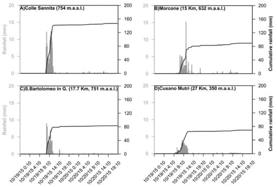 Ten-minute and cumulative rainfall for the event on 19–20 October 2015 recorded by some significant stations, starting from the maximum peak of intensity (Colle Sannita). See Figure 2 for station locations.