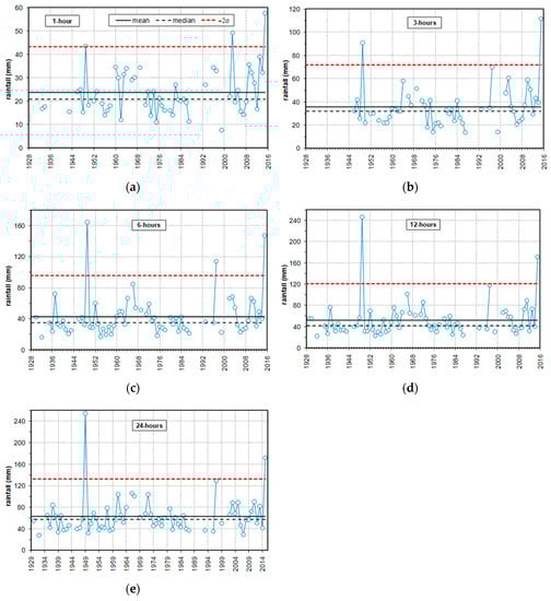 Time series of annual rainfall maxima in 1, 3, 6, 12, and 24 h (a–e) from the S. Croce del Sannio rain gauge (724 m a.s.l., from 1929 to 1999) and the Colle Sannita rain gauge (740 m a.s.l., from 2002 to 2015). The mean, median, and mean +2 standard deviations (+2σ) are also shown. Some data are missing.