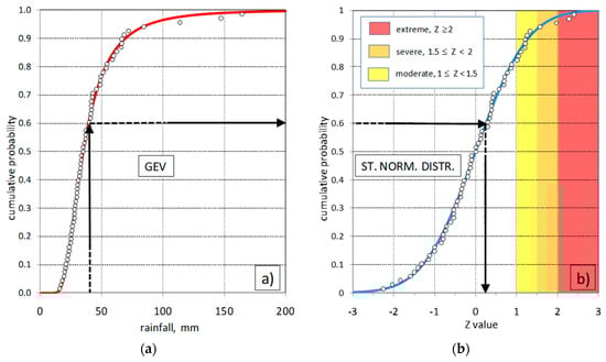 (a) Six-hour rainfall data series plotted by the Weibull formula and fitted by the Generalized Extreme Value (GEV) distribution; (b) cumulative probability transformed into the Z value of the standard normal distribution transformation.