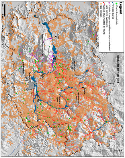 The rainfall events had multiple effects throughout the Benevento province: floods, landslides, and extensive soil erosion damaged agriculture and infrastructures in a wide area. Due to its geological and morphological characteristics, the Benevento province is already a fragile environment that is extensively afflicted by surficial geomorphological processes. For example, the Landslide Index (LI, defined as the percentage of area affected by landslides per unit area) in some sectors exceeds 75% [].