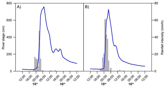 The first storm caused the overflow of the Calore River and had a sudden peak induced by the water received from the Tammaro River—a right-bank tributary—and by the minor tributaries upstream and downstream of the town of Benevento. Upstream, the overflow started in the middle course of the Tammaro River and propagated along the segment of the Calore River that crosses the city of Benevento. At almost the same time, inundations occurred along the middle-lower course of the Calore before the propagation of the flood wave upstream (Figure 7). The evolution of the process was partly influenced by the lamination effect of the Campolattaro dam. The rivers’ responses were very rapid according to a comparison of the rainfall data and water stream levels registered by the Ponte Valentino and Pago Veiano monitoring stations, which are respectively located next to the confluence between the Tammaro and the Calore rivers in the industrial area and along the lower course of the Tammaro river (see Figure 7 for location). The storm did not damage these two stations. The Ponte Valentino storm hydrograph (Calore River) shows a lag time of about 4 h (Figure 8A), while the Pago Veiano storm hydrograph (Tammaro River) indicates a lag time of about 3 h (Figure 8B). From these lag times, the flooding event is defined as a flash flood. Additionally, the graph in Figure 8A indicates that, in the town of Benevento, the maximum stage and therefore the maximum extent of the area affected by the flood were reached at around 7:00 a.m.