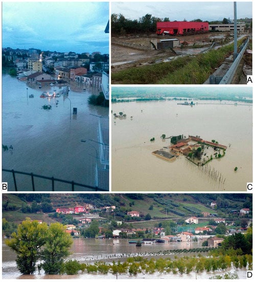 Overflow of the Calore river: (A) Damages in the industrial area of Benevento; (B) flooding at the “Ponticelli” locality, Benevento town; (C) and (D) flooding at the “Pantano” locality, Benevento town.
