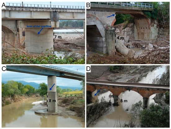River stage during the overflow of the Tammaro and Calore rivers and Tammarecchia torrent, evidenced by flood marks on bridges, in different places across the Benevento province: (A) The Tammaro river in the industrial area (ASI) of Benevento; (B) the Tammarecchia torrent in Circello; (C) the Calore river in Paupisi; (D) the Tammaro river southwest of Circello.
