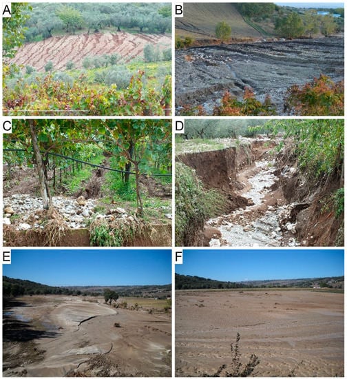 Erosional processes along slopes and floodplains: (A) Concentrated rill erosion; (B) rill and sheet erosion on a cultivated slope; (C) gully erosion in a wine groove; (D) gully erosion along a pre-existing channel; (E) erosive flooding on a floodplain; (F) sediment deposition along the floodplain.
