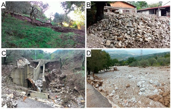 The frequency of destructive, storm-induced phenomena in the Mediterranean region is increasing, possibly as a consequence of ongoing climate change e.g., [,,,]. In the last several decades, thousands of victims and huge economic losses worldwide have resulted from landslides and floods induced by intense meteorological events e.g., [,]. Therefore, studies on these kinds of events and their impact on urbanized environments have increasingly played a pivotal role in hazard evaluation, risk assessment, and mitigation strategies, as well as the safeguarding of human lives. For instance, Aronica et al. [] studied the catastrophic event that occurred on 1 October 2009, which induced extensive floods and debris flows on the Ionian side of eastern Sicily (southern Italy) and caused 36 deaths in the village of Giampilieri. On the Tyrrhenian side of eastern Sicily, floods and landslides occurred on 22 November 2011 and caused three deaths in the Saponara village []. Similar events transpired on 25 October 2011 and hit different areas of Italy between eastern Liguria and northern Tuscany, causing 13 fatalities [].