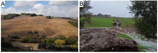 As shown in Figure 7, erosional processes occurred extensively throughout the whole province, even though they were concentrated around the NE–SW axis of the storm. Figure 7 is a comprehensive map of both the linear and surface erosion that resulted from the two storms. The soil erosion in the map includes sheet, rill, and gully erosion, resulting in a total affected area of about 930 km². Most of the affected area is devoted to agricultural use, especially for the production of wine, oils, and cereals.