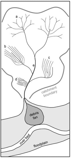 Schematic reconstruction of typical morphological structures of coalescent rills that induce debris flows identified in the study area: (a) Dendritic arrangement; (b) subparallel rill systems, parallel to the direction of the main creek; (c) subparallel rill systems, orthogonal to the main creek; (d) subparallel rill systems, directly flowing into a high-order gully (e).