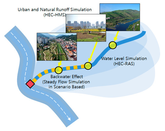For hydraulic and hydrologic analysis of urban small and medium-sized stream watersheds, we established an analysis scheme by interactively integrating the two most commonly used models, the Hydrologic Engineering Center’s Hydrologic Modeling System (HEC-HMS) and the HEC’s River Analysis System (HEC-RAS). When the inflow estimated using HEC-HMS passed through the channel, the water level at each observation point was determined using HEC-RAS (Figure 1). The aim of this research was to construct a flood forecasting and warning system. Swift rainfall-runoff simulations under several design frequencies were needed to realize this aim. HEC-HMS, which is a semi-distributed hydrological model, is easy to build and it can mimic the flooding performance in a watershed using simple functions. In addition, HEC-HMS is used in flooding analysis for flood disaster prevention in South Korea. Therefore, this study adopted HEC-HMS as the rainfall-runoff model. The backwater effect on the water level was taken into account by adjusting the known water surface (WS) elevation of HEC-RAS for each scenario [23,24]. Although simulations of situations similar to those in real life can be performed by modeling the water levels using the unsteady flow simulation feature of HEC-RAS, this process is very time consuming. Therefore, we simulated the effect of the upstream backwater, which depends on the downstream water level, in each scenario as a steady flow. Despite the higher number of simulation runs for various water levels when simulating steady flow, this method is simpler than unsteady flow simulation.