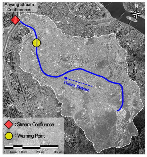 Dorim Stream is a tributary of a branch of the Anyang Stream. Its watershed covers 4250 ha, and the total channel length is 14.51 km. It flows through the major high-population-density areas of Seoul, covering five districts: Gwanak-gu, Guro-gu, Geumcheon-gu, Dongjak-gu, and Yeongdeungpo-gu. The Dorim Stream watershed has no sub-streams because it flows through the city center, where most small water bodies are covered. Figure 3 and Table 2 show the characteristics of the Dorim Stream in detail.