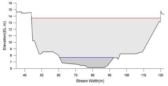 Dorim Stream watershed is an urban watershed suitable for flash flood forecasting to prepare for floods because the stream flows through the city center from its origin to the downstream confluence. The flood warning point of the Dorim Stream is Sindorim Bridge (No. 18), 1500 m upstream of the point of its confluence with the Anyang Stream. It is a candidate high-water mark location for the operation of the envisaged flood forecasting and warning system. The presence of levees makes this location suitable for issuing flood warnings or evacuation orders. Figure 4 shows the cross-section of the stream at the Sindorim Bridge flood warning point.