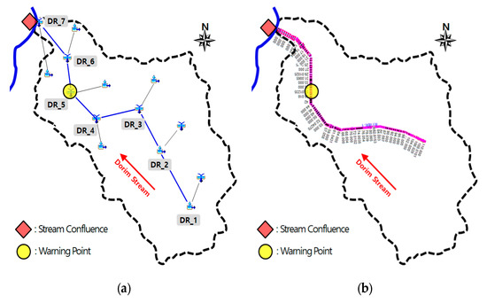 They noted that runoff behavior plays an important role in runoff routing and presented the results of diffusive transport using a GIS-based model by applying a grid mesh to the Attert catchment in Luxembourg. For model verification, they compared the results of runoff routing from each cell with the data collected over the previous 30 months, which yielded similar hydrographs for the predicted and observed values. Khalfallah and Saidi [19] predicted runoff probabilities according to GIS-based rainfall frequency mapping and presented the flood simulation results obtained by applying the prediction results to the Hydrologic Engineering Center’s River Analysis System (HEC-RAS). Cohen et al. [20] regarded the longitudinal river slope as a key parameter that determines flood discharge variability. They proposed a methodology for calculating the river slope using the Global River-Slope dataset and used the modified river slope for modeling. They also presented regression analysis results depicting the correlations between the catchment parameters and river slope, which are necessary for flood discharge estimation. Prediction using a distributed model is very important because it takes into account the non-uniformity of the geomorphological spatial distribution. However, this prediction process is time consuming because its rainfall-runoff simulation requires hydrodynamic numerical analysis. Furthermore, studies on flood forecasting and warning systems using distributed models are limited to small sub-watershed areas or low resolution.