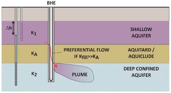 From a hydraulic point of view, BHEs could be modelled as a concrete column installed vertically in the subsurface, with a different hydraulic conductivity () compared with the surrounding ground. If the grout is more permeable than a certain layer crossed, or pipes do not adhere well to the grout, the borehole could become a preferential conduit for the migration of contaminants. Such conditions are depicted in Figure 2, showing a BHE crossing both a shallow (contaminated) and a deep (clean) aquifer, these two separated by an aquitard or aquiclude with a hydraulic conductivity ; if not properly sealed (i.e., if ), the BHE may trigger the propagation of contaminants from the shallow to the deep aquifer. Cross-contamination may also from a contaminated deep aquifer (e.g., with a high salinity) with a higher hydraulic head compared with the shallow aquifer.