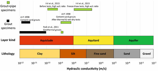 Comparison between hydraulic conductivities of geothermal grouts from laboratory tests (refer to the works of [21,22,23] for details of the references cited on the figure) and of typical aquifer, aquitard and aquiclude lithologies (see the works of [67]).
