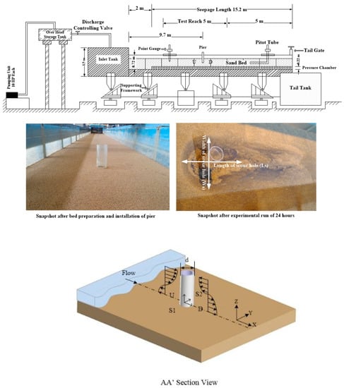 - Chavan, R.; Kumar, B. Experimental investigation on flow and scour characteristics around tandem piers in sandy channel with downward seepage. J. Mar. Sci. Appl. 2017, 16, 313–322. [Google Scholar] [CrossRef]