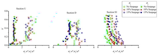 Laterally to the pier (S1), in the case of 10% and 15% seepage percentages, near the bed (h+ < 0.2), σu and σw increase at an average about 20%–30% and 25%–35% with no seepage value, respectively, because of the enhanced turbulence near the bed.