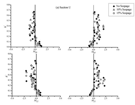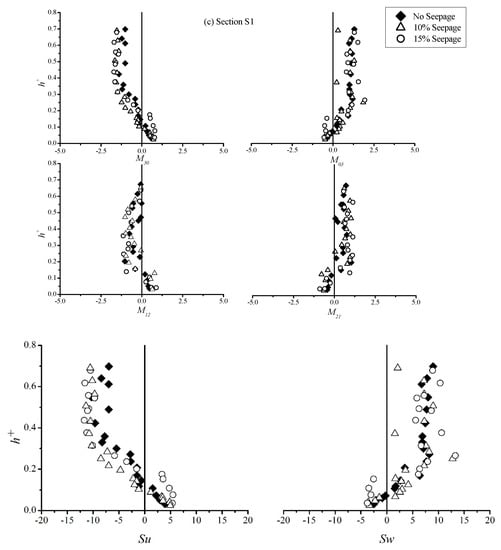 In the Section S1, near the bed, M30 and M12 increase with the seepage percentage, because of the increased particle mobility in the seepage runs. Similarly, the increased M03 and M21 in the seepage runs, correspond to the increasing vertical flux of RNS, and the advection of streamwise RNS in a downward direction, respectively. In the section of S1, in the seepage runs, the distributions of the skewness that factor their increase with h+, clearly show the increased movement of bed particles. These results show the prevalence of a high turbulent activity, resulting in enhanced sediment transport, laterally to the pier, in the case of seepage runs.