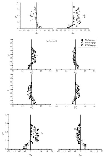 In section D, near the bed, M30 is negative, while M03 is positive, suggesting that the streamwise and vertical RNS fluxes are in an opposite direction to the flow, and in an upward direction, respectively, showing ejections. By increasing h+, M30 and M03 attain an opposite sign, becoming positive and negative, respectively. Near the bed, M12, is positive, while M21, is negative, showing that the diffusion of vertical and streamwise RNS is in the flow and in downward directions, respectively. By increasing h+, M12 becomes negative, while M21 becomes positive, showing the diffusion of vertical and streamwise RNS in the opposite direction to the flow, and in the upward directions, respectively. In section D, near the bed, positive Sw and negative Su show that the transport of the turbulent kinetic energy is in the opposite direction to the flow, and in an upward direction, respectively, increasing the seepage percentage. The results confirm the dominance of the secondary currents downstream from the piers, because of the formation of wake vortices; however, downward seepage limits the strength of the wake vortices.