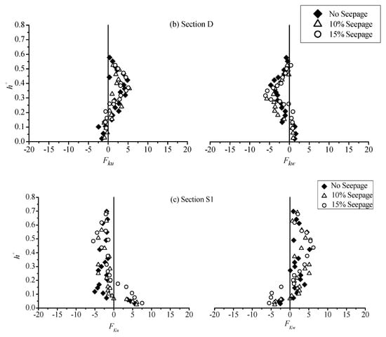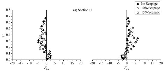 and are scaled with the shear velocity u*, thus obtaining (Fku = fku/u* 3) and (Fkw = fkw/u* 3), respectively. The vertical profiles of the TKE-flux around the pier, for all of the experimental conditions, are shown in Figure 4. In particular, upstream of the pier (U), near the bed (i.e., h+ < 0.2), Fku is positive and Fkw is negative, in agreement with the bed erosion as a result of the flow separation upstream of the pier. However, in the case of seepage runs, the absolute values of Fku and Fkw decrease, because of the lower erosive capacity of the reversal flow. Downward the pier (D), near the bed, FKu and FKw show slightly negative and positive values, respectively, with absolute values decreasing with the seepage percentage. This trend shows the hindered flow and the effects of low-speed incoming fluid particles. Moving towards the free surface, approximately at the edge of the scour hole (h+ ≈ 1), FKu and FKw become positive and negative, respectively.