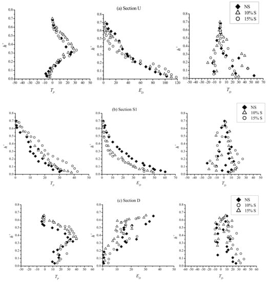 Non-dimensional distributions of turbulent production (TP), turbulent kinetic energy dissipation (ED), and diffusion (TD) for NS, 10% S, and 15% S in the following sections: (a) U; (b) S1; (c) D.