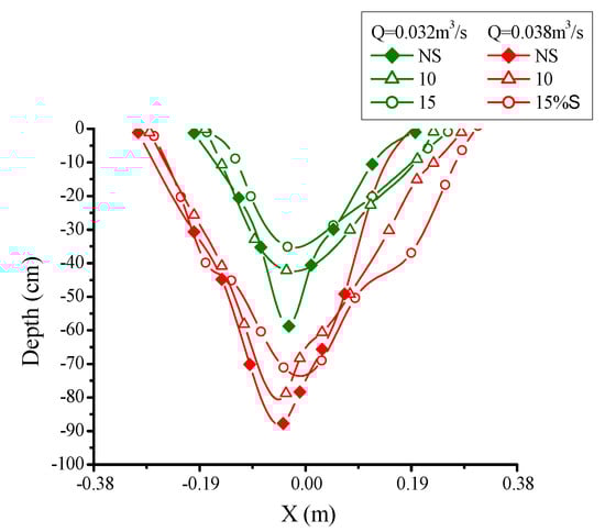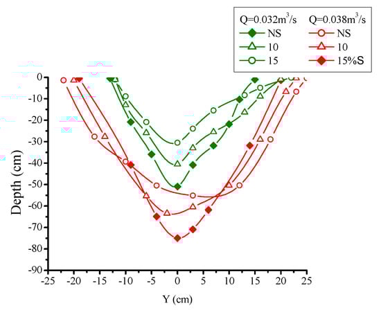 Upstream of the pier, in the seepage runs, the reversal flow hindered by the lateral flow through the channel boundaries results in a reduction of the scour depth and the scour length, while downstream the pier, the increased momentum transfer results in the erosion of the bed material and an increase in the scour length. Similarly, from Figure 7, it is possible to observe that the scour hole is wider in the seepage runs than in no seepage run.