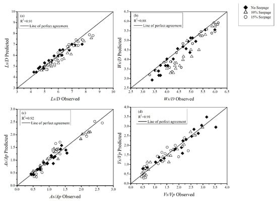 Comparison between the predicted and observed values of the dimensionless (a) scour length (Equation (5)), (b) scour width (Equation (6)), (c) scour area (Equation (8)), and (d) scour volume (Equation (9)).