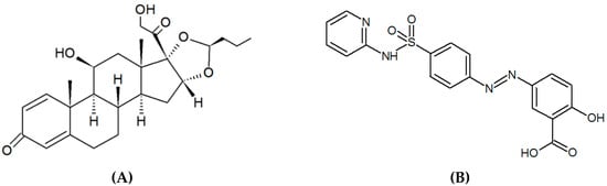 Molecule structure of: (A) budesonide (C25H34O6, MW = 430.53 g mol−1) and (B) sulfasalazine (C18H14N4O5S, MW = 398.39 g mol−1).