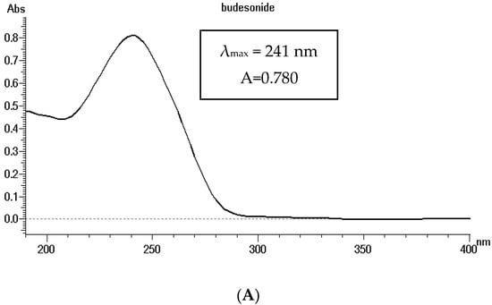 BUD (MW = 430.53 g mol−1, log Kow = 2.4–2.7) and SULF (MW = 398.39 g mol−1, log Kow = 3.7–4.8) are soluble substances in methanol (Figure 2). The absorption spectrum of the methanolic solution of these substances at a concentration of 5 × 10−5 mol L−1 were recorded. BUD has an absorption maximum at 241 nm and SULF at 366 nm (Figure 3).