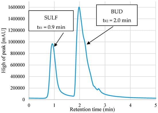 The chromatographic separation was performed on a Lichrospher 100 RP-18 column (125 mm × 4.6 mm, 5 µm). In order to obtain optimal conditions for HPLC-UV chromatography analysis, a suitable mobile phase was chosen to ensure proper peaks in the chromatogram. The literature review shows that the following phases were used for the determination of BUD: acetonitrile–phosphate buffer (pH 3.2) (55:45, v/v) [], methanol–water (80:20, v/v) [], and for SULF: methanol–acetate buffer (48:52, v/v) [], acetonitrile–acetate buffer (gradient elution) []. It was decided to check such phases as: methanol–water (70:30, v/v) and acetonitrile–water (50:50). The most symmetrical and highest peaks were obtained when the methanol–water phase was used. The selected mobile phase was also checked at various volumetric ratios of methanol and water. A flow rate of 1 mL min−1 was maintained. The injection volume was 50 µL. The typical chromatogram is presented in Figure 4.
