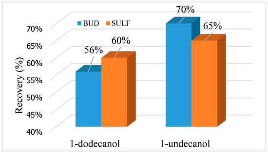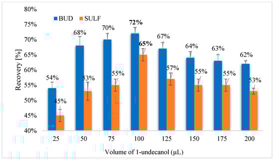 Optimizing solvents is critical for obtaining good extraction recoveries in DLLME-SFO method. The extraction solvent significantly influences the extraction efficiency. The selection of solvents for the isolation of BUD and SULF using the DLLME-SFO technique from aqueous solutions was checked. Solvents used for DLLME-SFO extraction have a density less than water and a freezing point close to room temperature (Table 1). The following solvents were used to isolate BUD and SULF: 1-dodecanol (C12H25OH) and 1-undecanol (C11H23OH). The density of these extractants is 0.83 g cm−3, and the pour point is 22–24 °C (1-dodecanol) and 13–15 °C (1-undecanol). It has been found that the extraction of selected analytes can be used for both 1-dodecanol and 1-undecanol, however, the highest extraction efficiency for BUD and SULF were obtained by using 1-undecanol (Figure 5). Recovery for BUD was 70%, whereas for SULF it was 65%. It was decided to check its volume in order to obtain high recoveries. The volume of 1-undecanol in the range of 25–200 μL was tested. A series of solutions were prepared and injected with 1 mL of the dispersant (methanol) and variable volumes of the extractant (Figure 6). The highest efficiency of DLLME-SFO extraction for both analytes was obtained using 100 μL of 1-undecanol. Increasing the volume of the extractant resulted in a decrease in recovery and a simultaneous increase in the volume of the extract.