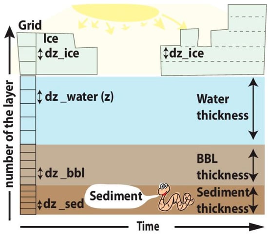 SPBM uses a fixed grid structure for the water column and sediments, and a time-dependent grid for the ice column. The number of grid points inside the ice column can vary with time but the spacing is fixed (see Figure 1). Water column layer depths () are taken as input from a hydrophysical model (distances between layers can be unequal) and extra layers are incorporated in the lower part in order to fully resolve the BBL. Total ice thickness () for every day of simulation is also taken as input from a hydrophysical model, and the ice column is constructed using a fixed layer thickness () as an input parameter. Therefore, the ice column is discretized into layers of strictly constant thickness , and when the ice column grows or melts its total thickness can change only by multiples of . This simplification facilitates recalculation of the variable concentrations during melting and freezing.