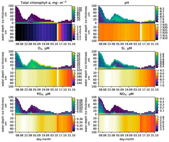 Figure 3 shows a SPBM–ERSEM–BROM coupled system output (for chlorophyll a, pH, oxygen, and nutrients) in the ice and upper water column layers during the period with maximum ice algae chlorophyll a concentration. This maximum is a result of thin ice (<50 ) during at least one month and favorable irradiance conditions. Chlorophyll a, oxygen, and nutrients are all state variables and therefore output as concentrations per unit total volume; pH is a diagnostic variable and is output as the negative logarithm of hydrogen ion concentrations of brine or seawater. The modeled values were compared with observed concentrations of biogeochemical tracers in sea ice during spring in the Arctic provided by [] (p. 210). Most model ranges fall inside the observational ranges (see Table 1). Also, Figure 3 shows that the modeled vertical distributions in sea ice reproduce some commonly observed features []: during ice melt chlorophyll a concentrations are highest in the bottom layer; during freezing the pH increases in the upper ice layers, reaching values higher than 10 during winter (see supplementary material) in accordance with observations []; nutrients have maximum values on the lowest ice layer, phosphates and nitrates are almost depleted in all ice layers except the bottom one; oxygen profiles in ice have a complicated structure with two maxima, in the middle and the top ice layers. Modeled oxygen are somewhat low compared to the observational range in [,] (see Table 1). Observed values include oxygen from gas bubbles that are incorporated into the ice and which are not available for biogeochemical reactions in brine channels, while the modeled ice oxygen is only the oxygen dissolved in ice brines.
