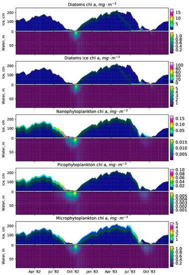 Figure 4 shows ice/water biomass concentrations of the five primary producer functional groups during the year of maximum primary production and the preceding year. The year of maximum primary production (1983) shows the springtime migration of the modeled ice diatoms and diatoms from the top to the bottom ice layer. The nanophytoplankton and picophytoplankton remain in the uppermost ice layers, while the microphytoplankton migrate downwards during the final stage of the melting season. All modeled primary producers start growing from the surface ice layers, where they were frozen during previous year ice buildup. In years with high irradiance and low summertime ice cover the concentrations of nanophytoplankton and picophytoplankton in the water column are much higher (see supplementary material) and can exceed the diatom concentration.