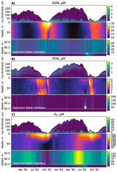 The simulation reproduces some general features of sea ice–water–sediment seasonal biogeochemistry connected with the seasonal production and decomposition of OM. Phytoplankton (one state variable in BROM) starts to bloom in the ice and below the ice during ice melting (see supplementary material). Phytoplankton blooms in the upper water column lead to a seasonal increase in dissolved organic matter (DON, Figure 5A, in nitrogen units), dead particulate organic matter (PON, Figure 5B, in nitrogen units), and dissolved oxygen (Figure 5C), followed by oxygen consumption in the lower water column/BBL and the generation of reduced forms of nitrogen (, ) at depth (Figure 6C). DON is incorporated into the ice during freezing, but since BROM only models the labile fraction at present, the model DON is rapidly oxidized and contributes little to OM in the upper ice layers (Figure 5A). Here, the main reduction agent is PON, which occurs in ice due to decomposition of zooplankton (Figure 5B). The modeled oxygen in ice is almost depleted (Figure 5C). In the upper sediments, oxygen is depleted almost year-round, indicating active redox processes in this domain.